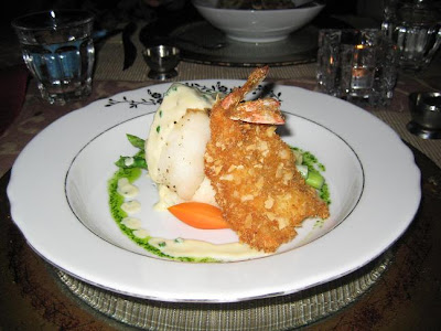 Seared Seabass and Deep Fried Almond King Prawn with Fennel Herb Cream